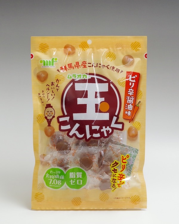 群馬県産の玉こんにゃくを独自の技術でピリ辛醤油味に仕上げました。二段熟成醤油を使用して玉こんにゃくの中心まで、しっかり味が染み込ませています。保存などに便利な個包装タイプです。