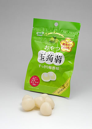 『おやつ玉蒟蒻 すっきり梅酢味』は、群馬県特産の玉蒟蒻を梅酢などで調味した後、ほどよく乾燥させ、飴玉サイズに加工したもので、蒟蒻のしこしこ感とさっぱりした梅酢の風味を同時に楽しめます。ポケットサイズ一袋の中身(30g)を全部食べても27Kcalと低カロリー。ヘルシーなのに満腹感も得られるところが特長です。