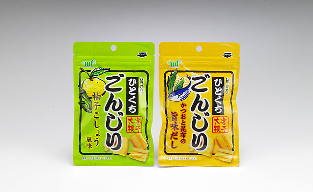 『ひとくちごんじり 柚子こしょう風味』は、厳選された大根を寒風の中で丹念に干し上げ、たべやすい一口サイズにカット後、柚子とこしょうの風味を加えてピリッと辛い独特のおいしさに仕上げました。